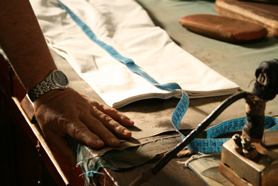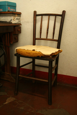 A cadeira também com mais de 40 anos onde ele costura. Na verdade ele parou de fazer ternos, agora reforma coisas pequenas só aluga os ternos. São mais de 500 feitos por ele.